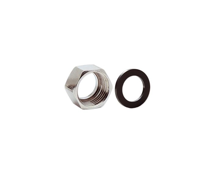Dado in ottone nichelato a sede speciale con filettatura femmina ISO 225 G a battuta piana e guarnizioni piane in NBR a norma EN 682 per gas. Nipplo M/M in ottone nichelato con doppia filettatura maschio ISO 228 G a battuta piana (A-B). Dado, guarnizione e nipplo idonei per tubo corrugato gas in acciaio inox AISI316L codice di riferimento F3896 901 050 e codici a seguire.