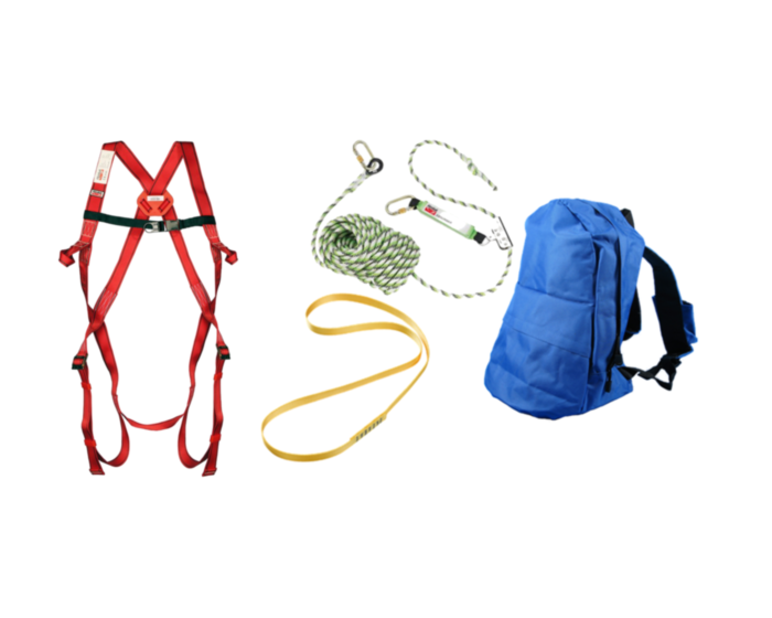Il Kit, composto da imbracatura, dispositivo anticaduta, fune e fettuccia, viene fornito in un funzionale e pratico zaino utilizzabile per inserire altri DPI come per esempio occhiali, guanti, ecc. e conservare i singoli libretti d’uso e manutenzione (i libretti servono per la revisione annuale secondo EN 365). I prodotti all’interno sono sempre a portata di mano e protetti dallo sporco e ordinati.